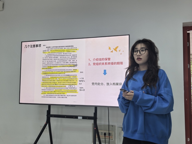 会前,学院联络员戚思懿对2025届毕业生党员和入党积极分子的档案材料进行整理、转移和归档。会上,戚思懿结合上级党委发布的相关通知,围绕档案转接展开详细讲解。她强调:毕业生党员需积极配合支部书记,认真核对转接党组织的名称、代码。同时,针对出国(境)、未就业等不同情况的党员毕业生,给出组织关系转移的具体指引,还着重强调了介绍信的重要性,要求党员学生妥善保存。