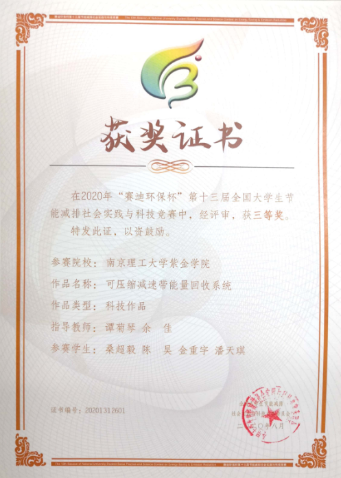 2020年8月27日-8月30日,赛迪环保杯第十三届全国大学生节能减排社会实践与科技竞赛决赛在重庆大学成功举行。在较早前完成的专家评议中,由我校智能制造学院教师谭菊琴、余佳等指导,桑超毅、陈昊等同学完成的“可压缩减速带能量回收系统”喜获全国三等奖。
