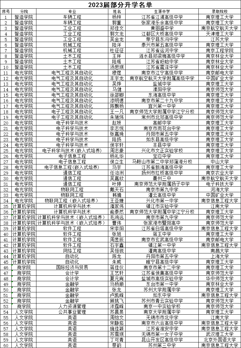 截止目前共有219名毕业生被包括中山大学、电子科技大学、南京理工大学、南京航空航天大学、南京师范大学在内的国内各大高校录取。其中,电子科学与技术专业考研率达25%,自动化专业考研率达18.99%,土木工程专业考研率达16.53%。